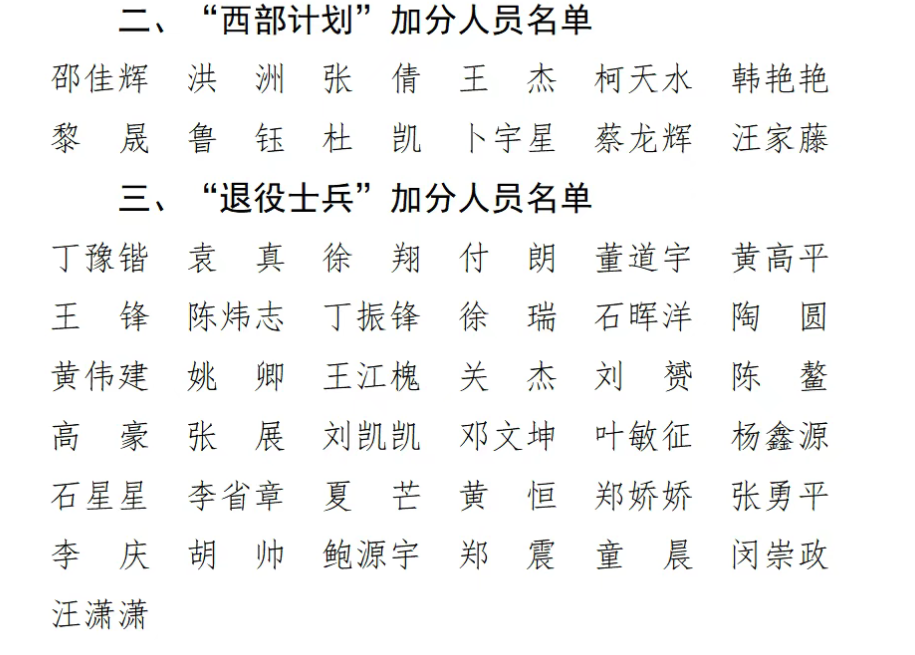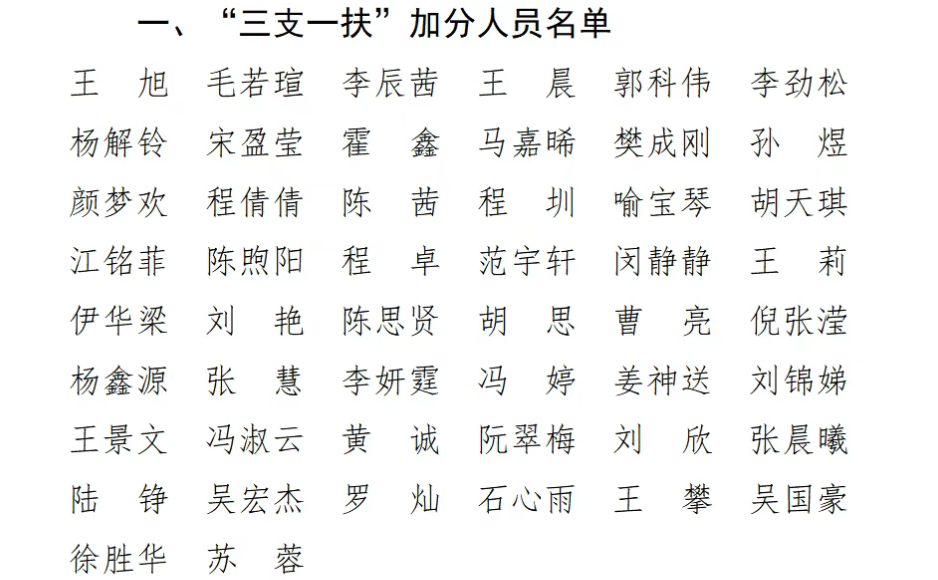 根据2025年9月26日《麻城市部分事业单位2025年公开招聘工作人员公告》及《麻城市部分事业单位2025年公开招聘工作人员笔试公告》要求,2025年7月31日前服务期满2年且考核合格(称职)的“三支一扶”计划、大学生志愿服务西部计划项目人员、在军队服役5年(含)以上的高校毕业生退役士兵提交相关材料,经审核合格的实行加分政策优惠。以上项目人员中已经通过考试等途径成为公务员(参照公务员法管理机关(单位)工作人员)或事业单位工作人员的,不再享受加分政策优惠。现将本次招考符合奖励加分人员予以公示。名单如下: